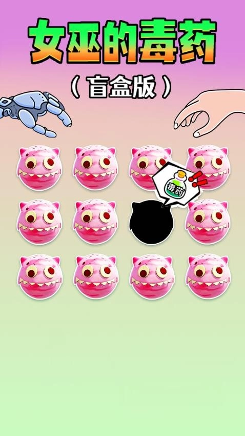 《女巫毒药选择》是一款趣味猜谜游戏,玩家进入游戏后即可与对手展开猜谜对决。游戏设有丰富的关卡,每个关卡都会呈现多种食物,玩家与对手需轮流点击食物:若选中正确食物,便可继续游戏;一旦点击到带有毒药的食物,则挑战失败。玩家的目标是避开毒药,诱导对手点击到毒药,从而赢得胜利。游戏包含多样的猜谜玩法,支持从食物、零食或盲盒中查找毒药,每个人都能在游戏里与对手自由猜谜,双方轮流点击,直到毒药被找到为止。需要的话就来体验吧!