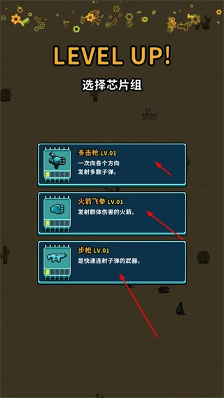 升级时,能够挑选不同的芯片组以提升自身能力,其中包含多击枪、火箭飞拳、步枪等多种选择,选定之后就能获取相应的武器能力。