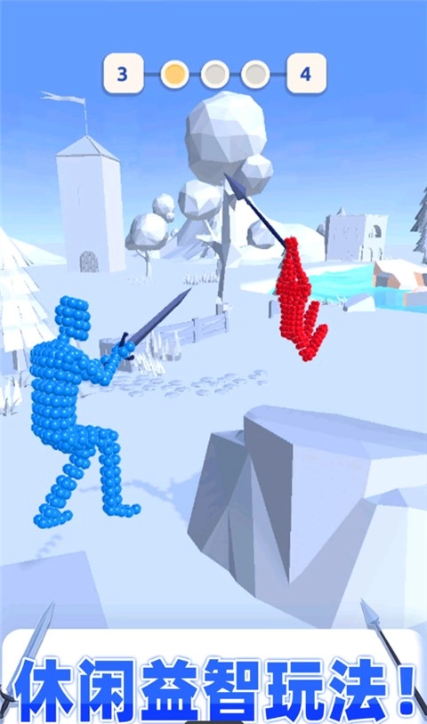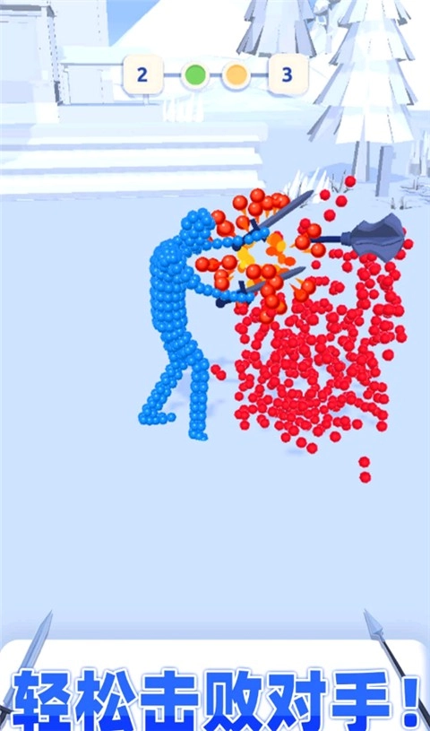 玩家操控小人进行对战,需点击按钮挑选武器,拖动屏幕调整小人姿态,这两项操作的配合会对进攻效果产生影响。