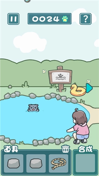 石头背后藏着一根绳子,去左边找到游泳圈,用绳子把游泳圈绑好,接着扔给主子完成救援。