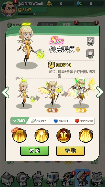 英雄形象采用Q萌风格,像“藕巴”(战士/击杀增伤)、“机械天使”(辅助/全体治疗)这类角色设计得十分可爱;而僵尸形象则走滑稽搞怪路线,以此弱化恐怖氛围,让游戏更具亲和力。