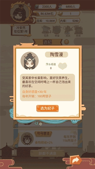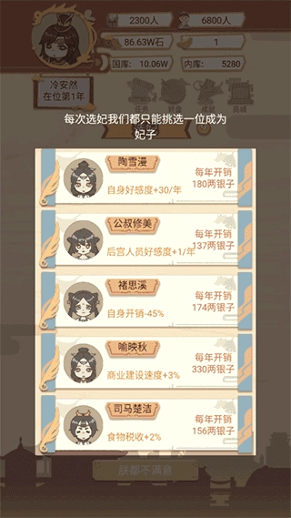 刚进入游戏的第一年默认会开启新手指引,但这并不强制要求你将角色升为妃子。按照指引进入升妃界面后,你仍然可以选择返回;即便已经成功晋升为妃子,后续也能将其贬为侍从。游戏开局时,内库的初始资金大约在5000左右。需要注意的是,侍从晋升为妃子的花销会直接翻5倍,而带来的加成效果却只翻2倍。目前为止,我还没见过初始花费低于70的后宫角色,也就是说,只要拥有一位妃子,每年的最低开销大概在80乘以5,也就是400到500之间,而实际遇到的角色往往都需要上千的花费。刚开局时,玩家几乎没有任何资源积累,本金非常有限,此时即使获得那点加成也难以发挥作用。如果前期就急着升妃,可能玩不到十年内库就会耗尽资金。所以,综合来看,游戏前期晋升妃子是很不划算的。