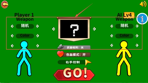 在设置界面中,为玩家1与AI挑选武器和颜色,同时对游戏难度以及控制方式进行调整。