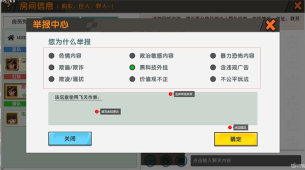 在举报类型中选择“黑科技外挂”,接着在下方的输入框里详细填写该玩家具体的作弊行为,最后点击【确定】按钮即可完成举报操作。