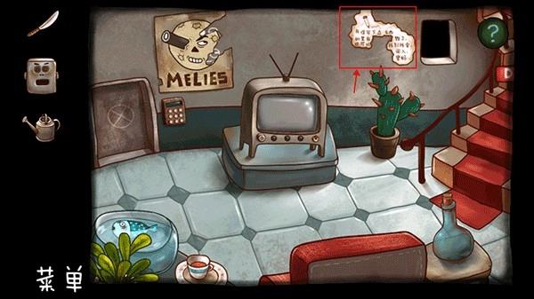 点击右下角水壶与雕像后方的碎纸片,把它们收集好,接着点击右下角的楼梯,前往下一层。