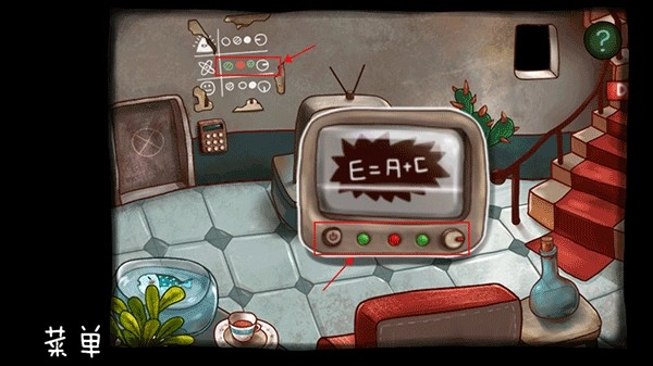 回到楼下后,先点击电视机,接着按下电视机左下角的开机按钮。之后分别操作中间的三个指示灯和右侧的旋钮,调整它们的状态,使其与墙上的排列完全一致。待电视成功开启后,即可获取信息E=A+C。