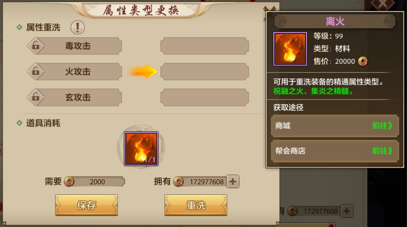 若少侠对已解锁的三条精通属性不满意,可消耗离火重新洗练这三条精通属性。离火可从商城与帮会商店获取。
