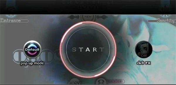 玩家在曲目界面单击后,会进入游戏准备界面。点击界面中间的START键即可开始游戏——该按键为蓝色圈样式,若对应曲目是隐藏曲目,则会显示红色圈。START键的左侧和右侧分别是pop-up mode设定按钮与click fx设定按钮。