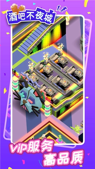 酒吧不夜城手机版是一款放置类模拟经营游戏,游戏整体营造出现代科技感的氛围。玩家将化身为酒吧老板,需要思考如何让自己的酒吧事业蓬勃发展。前期有小助理协助,能帮助玩家熟悉酒吧的运作流程。点击对应区域,不仅可以购置设备,还能对该区域进行华丽装饰——毕竟优质的环境才能吸引更多顾客。为此,玩家也能借助广告宣传来提升酒吧的人流量。当然,作为老板的核心是掌控全局,对于其他事务,玩家可以招聘员工协助打理,这里提供了前台人员、扫地机器人等不同类型的员工。游戏中加入的卡牌元素,能够在一定程度上提高工作效率,进而增加酒吧的营业收入。
