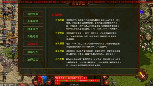 沙城争霸玩法规则如下:开区第10天起,每周六开放沙城争霸活动,每次奖励3000万金币,由胜利方单独获得。进入沙城议事厅时不可携带灵兽,需提前将豹魔石等灵兽相关道具存入仓库。沙城成员在一周内可进入沙巴克藏宝阁(该地图为沙城成员专属),玩家可从沙巴克皇宫内直接传送进入。此外,活动期间19:55-22:05将关闭爆率。
