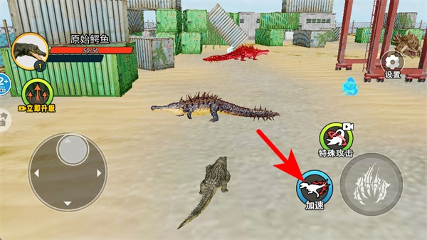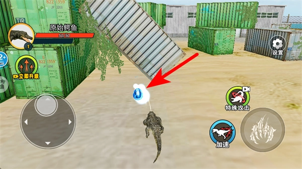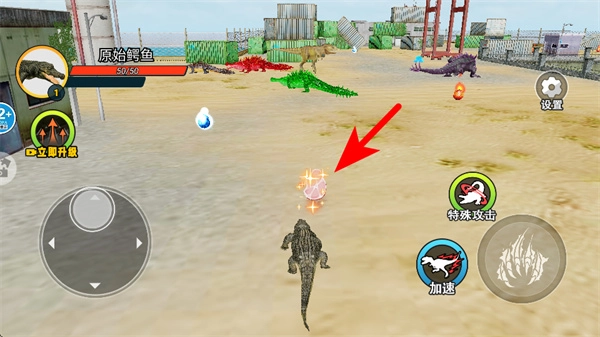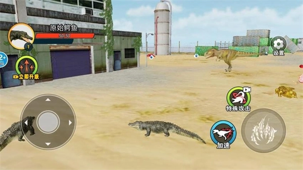 进入场景后,通过虚拟摇杆操控幼年鳄鱼在周围探索。当遇到能吃的东西或者弱小的猎物时,就发动攻击来获取经验值;要是看到大鳄鱼这类天敌,得马上躲起来,防止被它们捕食。