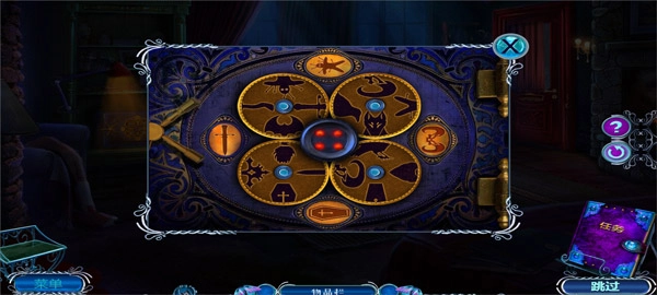 从书柜上取走开锁器与木板,再拿走右侧圆桌上的特殊眼镜——借助这副眼镜能够查看蓝色迷雾。