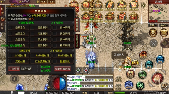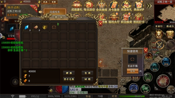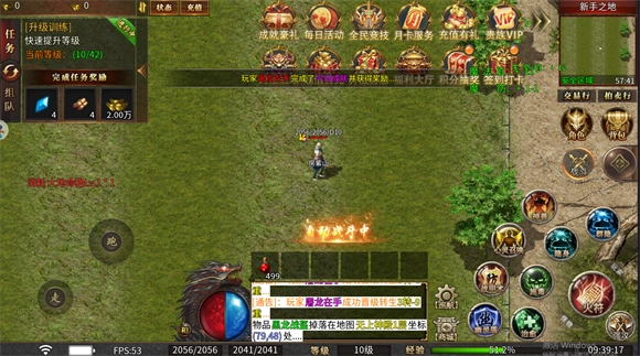 新手刚上线就能领取自动回收、自动捡物、自动挂机功能,还有随身仓库和全部开启的超大仓库;打怪时会自动触发绿毒、逐日剑法与开天斩技能,此外还具备大陆传送功能,建议跟随主线任务推进游戏进程。
