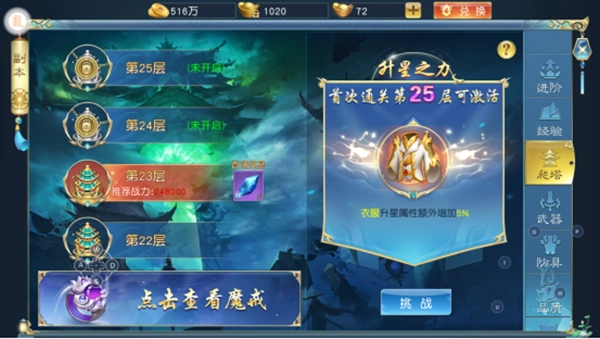 爬塔挑战副本支持无限次进入,但已通关的层数无法重复挑战;系统会在每日0点,依据玩家前一天的最高通关层数发放对应的奖励。