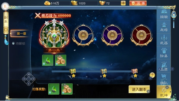 进入副本后,系统会依据通关时长评定星级;通关成功后,玩家可获得用于提升装备等级的升级石。进入副本需消耗一定的活力值与挑战次数,其中挑战次数支持额外购买。