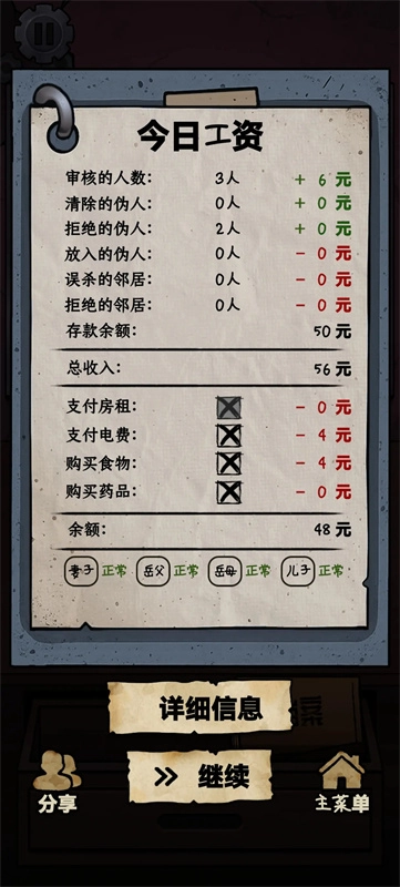 玩家要依据邻居出示的证件信息来分辨其中是否有伪人,若没有伪人,就能确认允许通行。