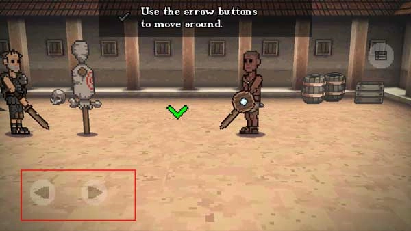 接下来是新手引导环节,第一步需要玩家通过左侧的左右方向按钮操控角色移动,当角色抵达绿色指示箭头所在位置后,即可开启下一步操作。