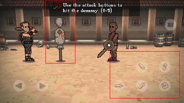下面就是具体操作,通过右侧的按钮用剑攻击木头人,攻击完成后新手教程就结束了。
