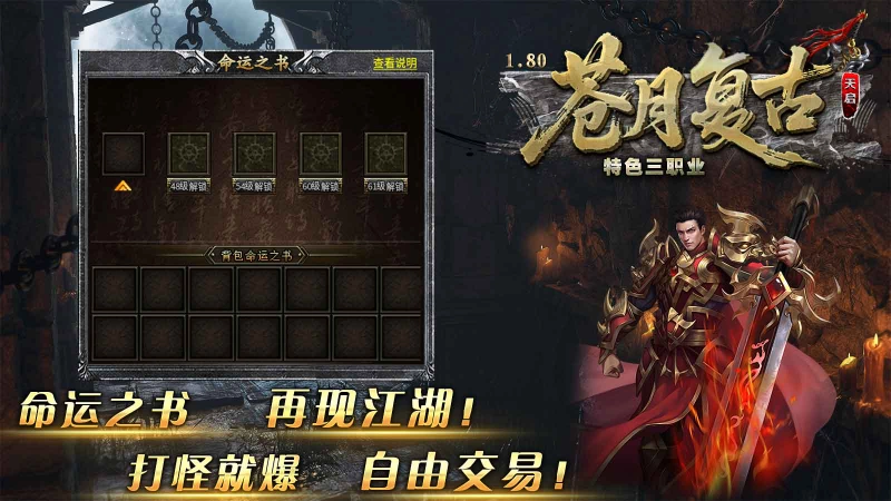 苍月复古三职业,180火龙三职业微变复古版本,血量破万的小怪就掉落所有终极装备,打造追梦生态大服!海量专属地图待你探索,还有众多隐藏BOSS等你挑战,各类极品装备都有机会获取,快来试试你是不是欧皇体质!本服装备全凭实力肝,投入时间就能拉近与土豪玩家的距离,人人皆可追梦,散人玩家也能逆袭成为大佬!