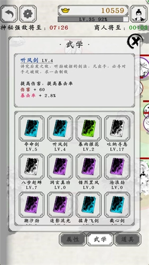 这款游戏和常见的割草游戏有所区别,玩家击败怪物不仅无法获取经验,反而会减少经验值。不过值得庆幸的是,游戏里设有商人,玩家能够通过购买随机武学和各类道具来增强自身属性。游戏中的流派十分多样,不同的构筑方式会带来各异的游玩体验,玩家可以选购不同道具来搭配专属组合,持续收集各种武学以战胜所有强大的敌人。