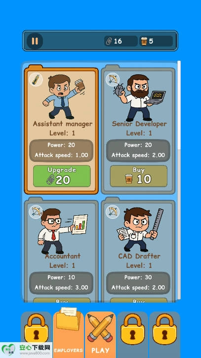 视觉呈现与玩法氛围高度统一:绚丽多彩的2D画面构建出轻松愉悦的基调,恰好契合“趣味十足”的玩法核心定位。员工丰富的动态表情(比如完成任务后的雀跃欢呼、加班时的倦怠神态),搭配场景里的细腻细节(像不停转动的时钟、堆积如山的文件),让画面更具鲜活感,也为原本紧张的职场管理过程增添了几分治愈气息,巧妙平衡了策略游戏固有的严肃感。
