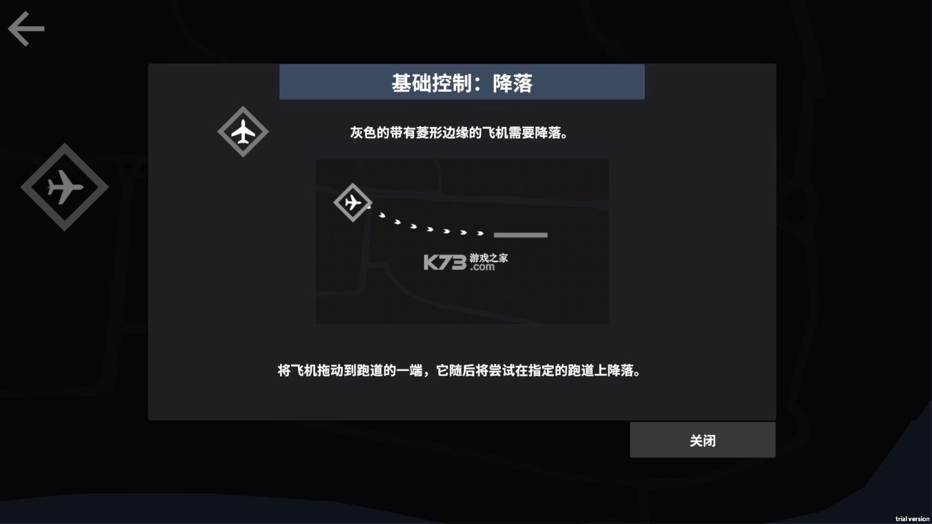 需要降落的是那架边缘呈菱形的灰色飞机,请把它拖到跑道的一端,之后它会尝试在指定的跑道上完成降落动作。