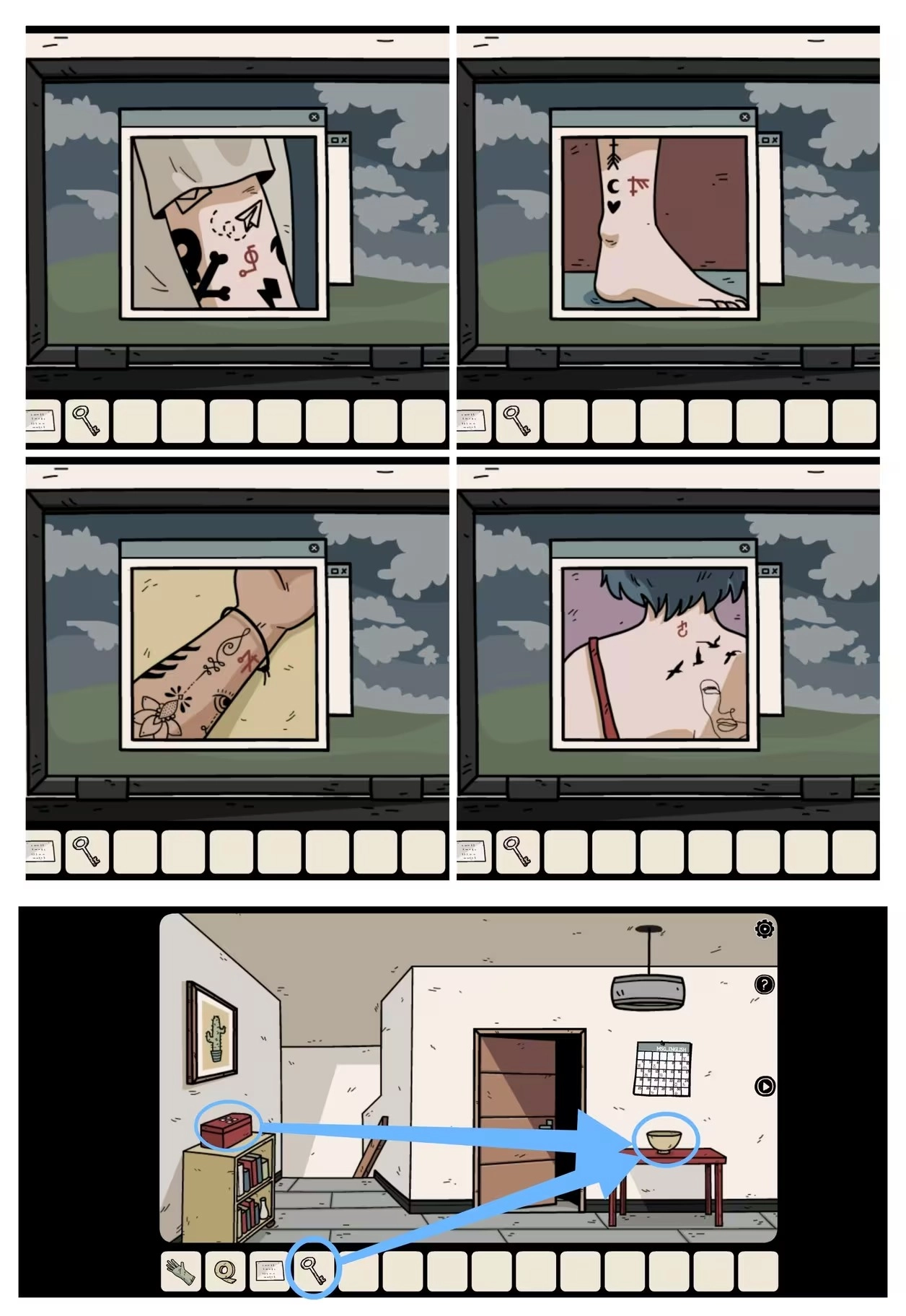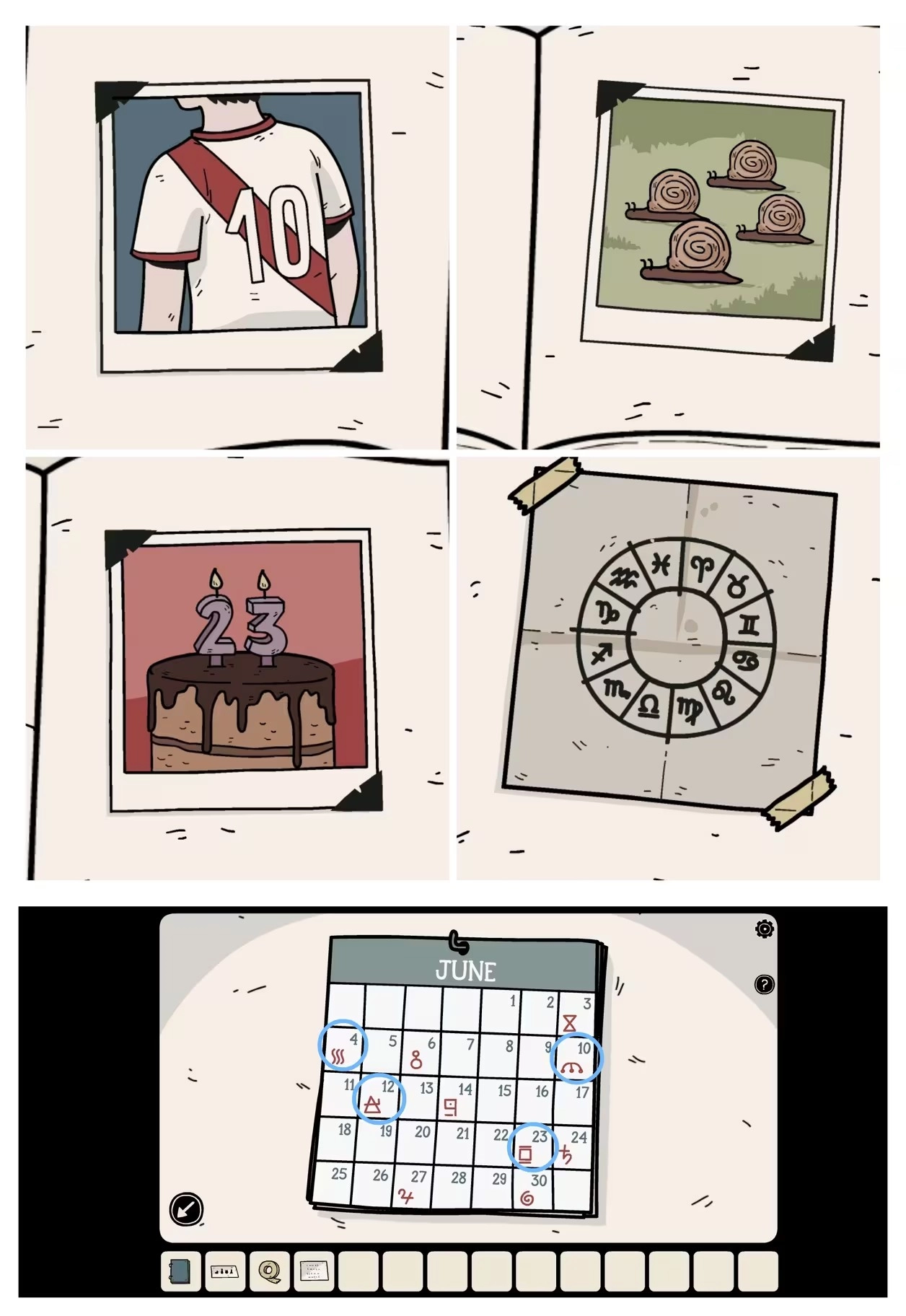 打开笔记本查看那四张照片(留意数字与数量信息),随后前往二楼的第一个房间门口,结合那里的日历获取四个「符号」。