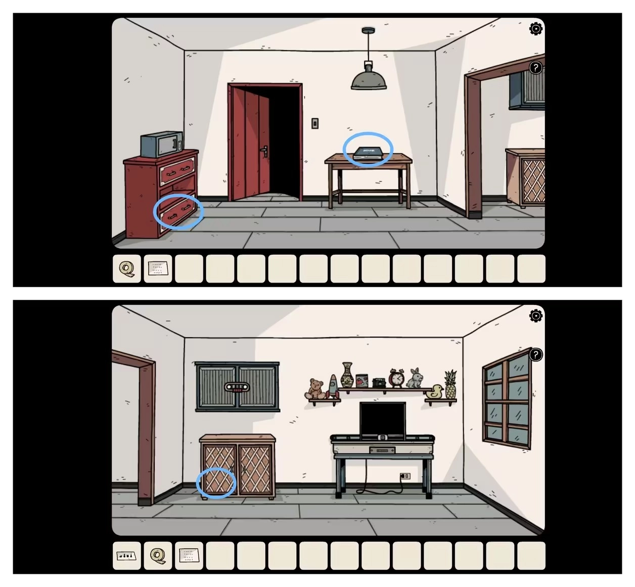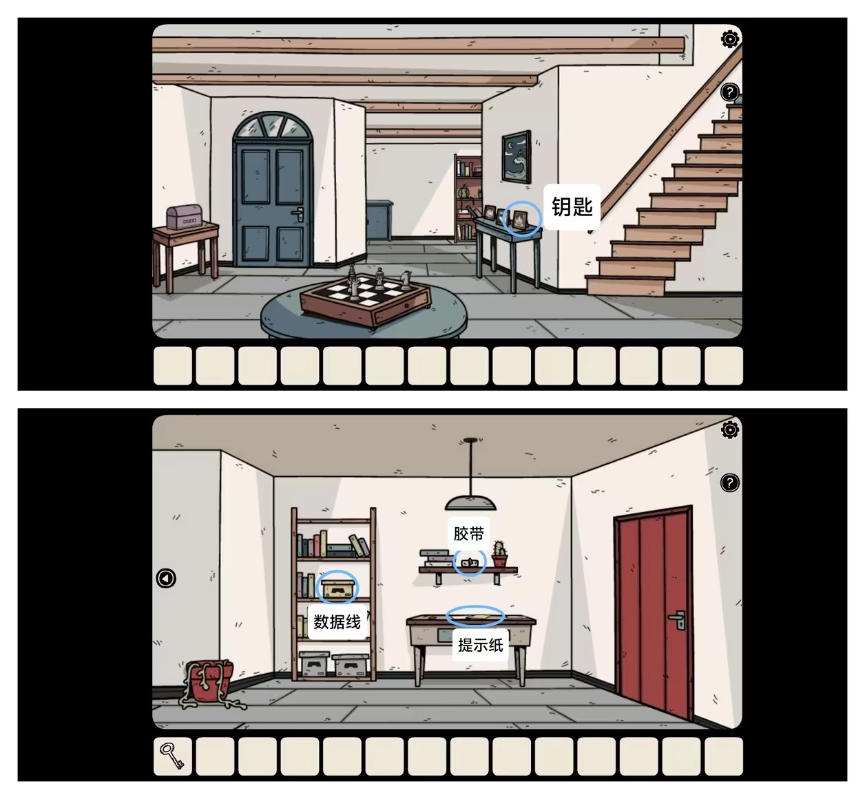 取走相框背面那把「生锈的钥匙」,接着前往二楼右侧,把「数据线」「胶带」和「提示纸」一并拿走。