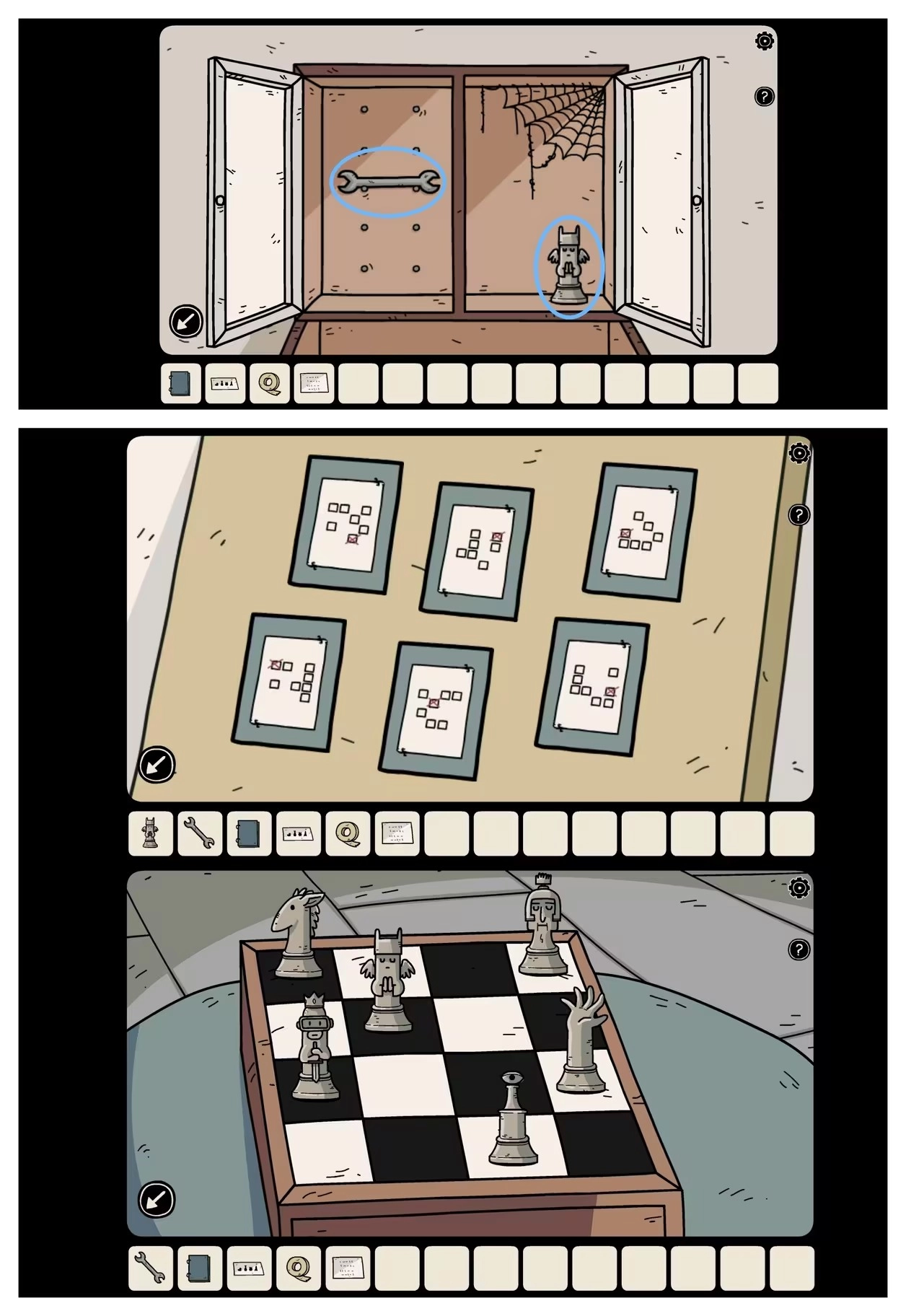 输入符号后打开书柜,取出「扳手」与「棋子」;随后查看留言板上的卡片,留意每个棋子对应的位置;再把棋盘上的棋子摆放到正确位置(如上图所示),即可获得「电池」。