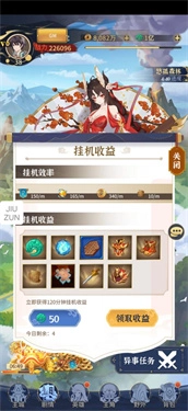 挂机:点击剧情后在左方可以领取我们的挂机收益,有非常大量的奖励可以领取,装备、金币、日常消耗的材料都是满满的,挂机收益是有限制的,玩家一定要记得定时定量上线领取。否则会相对定时登录的玩家来说吃亏了。不仅仅是只有挂机的时候才能有收益,玩家也可以购买两小时的挂机收益,第一次是免费,第二次则是50祥玉了,每次以50祥玉递增,每天都有5次机会可以购买。