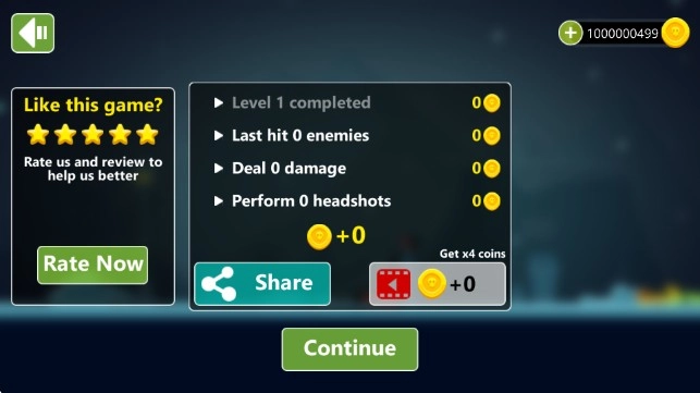 5:当关卡完成或者失败后,会展示关卡的完成状况、所获得的金币等相关数据,你可以点击“Continue”来继续下一次的挑战,也能够选择分享或者观看视频的方式以获取更多的金币。