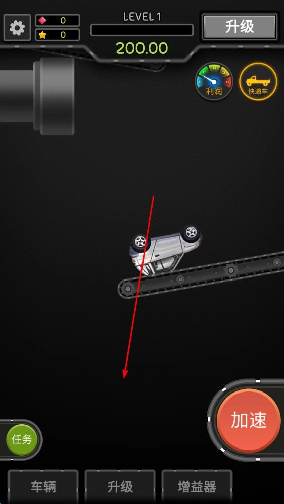 汽车粉碎玩法:点击传送带上的汽车,使其进入粉碎装置,还能通过加速按钮提高粉碎速度,从而更高效地获取收益。