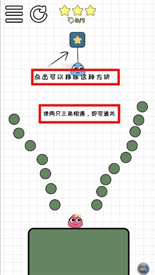 《恋爱三角游戏》是一款采用简约卡通画风的趣味休闲闯关小游戏。其玩法十分简单:点击悬挂着三角的方块,通过移动或消除方块,使蓝色小三角掉落并与粉色小三角相遇,两者触碰成功即可完成关卡挑战。每通过一关都能获得相应奖励,随着关卡数的增加,游戏难度也会逐步提升,界面中还设有技巧提示帮助玩家顺利通关。此外,游戏内包含多种角色形象、背景场景以及轨迹皮肤可供解锁体验。感兴趣的朋友们千万别错过这款有趣的游戏哦!