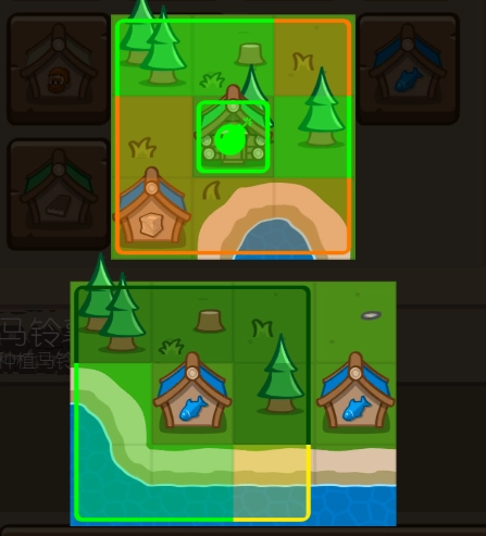 商人得把澡堂换成井,再跟酒吧调换位置。由于澡堂的覆盖范围更广,这样一来整个正方形区域就能被完全覆盖到了。