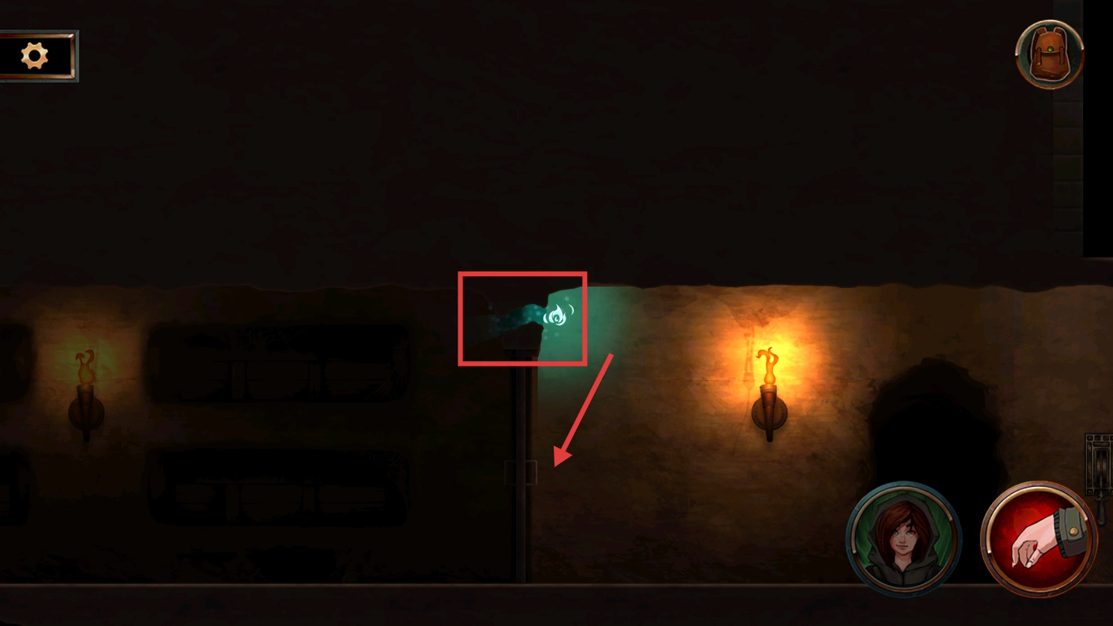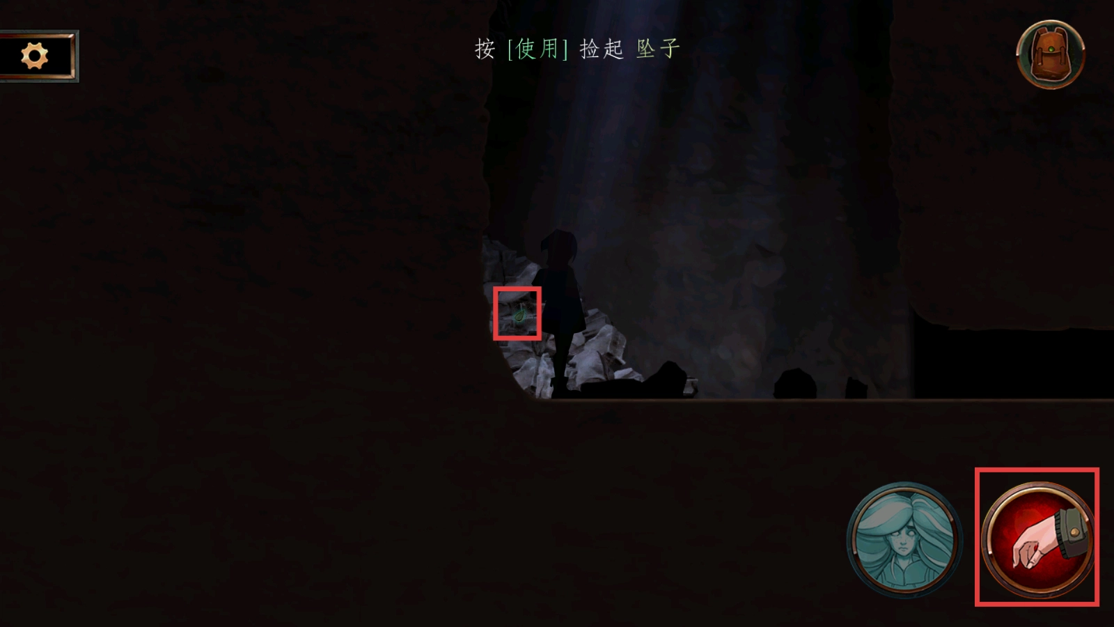 在洞穴场景里,当看到提示【按使用捡起坠子】时,点击右下角那个红色手掌形状的按钮,就能拾取到发光的坠子了。