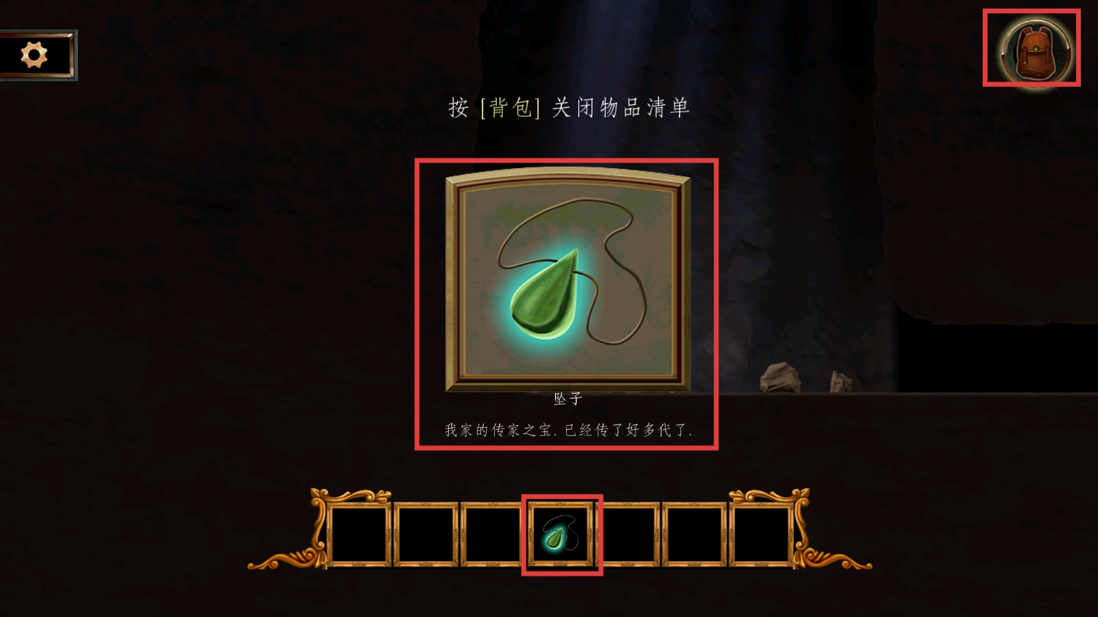 打开背包,查看刚拾取的【坠子】,得知它是传家之宝,然后按照提示再次点击背包按钮,关闭物品清单。