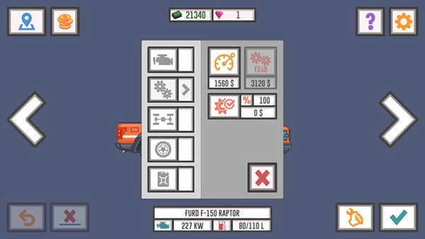 在这里能够对卡车的各类属性进行改造,像引擎、轮胎、耗油量之类的都包含在内。改装过程需要花费一定时长,你也可以选用金币来减少改装所需的时间。
