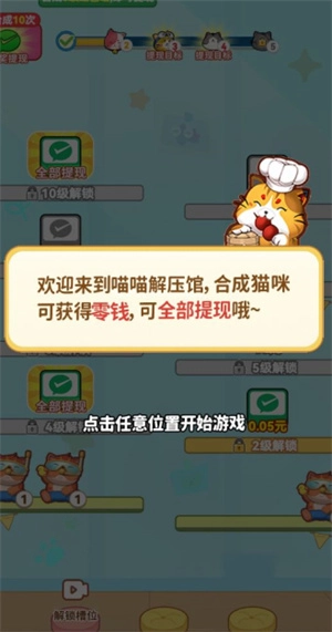喵喵解压馆是一款由天津活泼泼地科技有限公司运营的猫咪合成类游戏。在游戏中,玩家只需将三只相同等级的猫咪放置到同一个坐垫上,就能直接合成出一只等级更高的猫咪,同时还能获得特定的红包奖励。当红包满足提现要求时,玩家点击提现按钮,短短几秒内就能到账。