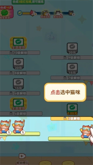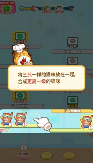 将三个一样的猫咪放在一起,就能合成更高等级猫咪。