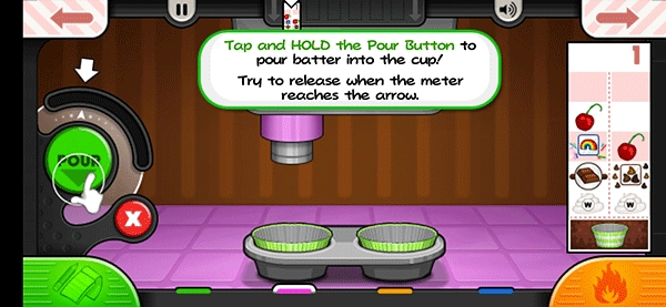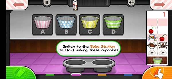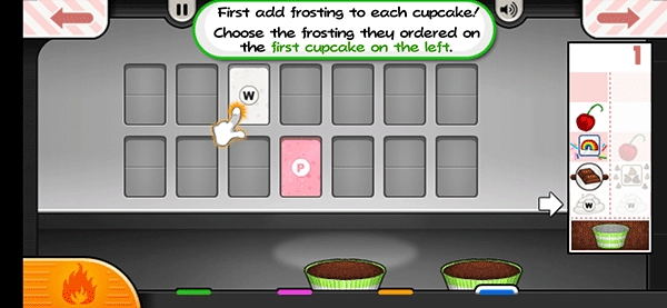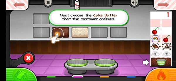 进入老爹蛋糕店游戏后,首先要接收顾客的订单,接着切换到面糊制作区域,开始制作纸杯蛋糕。