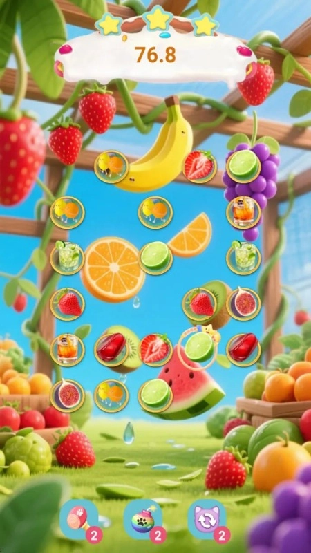 在游戏里留意棋盘上各类水果的排列分布,点击任意两个相邻的相同水果就能完成消除。