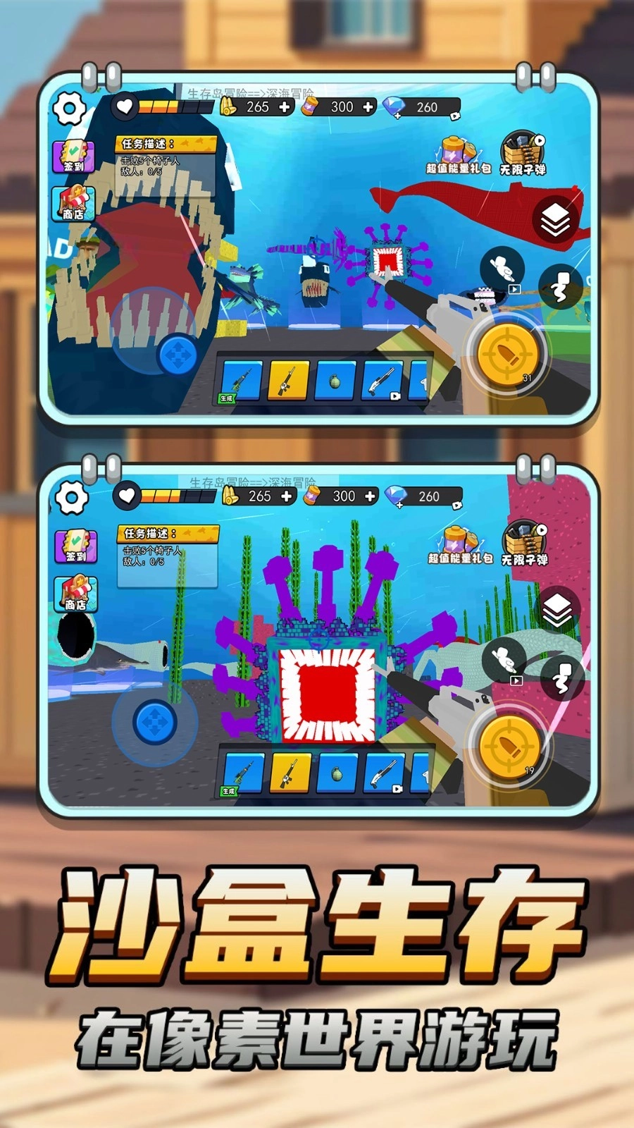融合生存岛冒险与深海冒险两种场景,能够在不同环境之间切换探索,从岛屿前往深海,丰富的场景变化带来了多样化的冒险体验。2、设置了明确的任务体系,例如击败指定数量的椅子人,完成任务可以获取超值能量礼包、无限子弹等奖励,为冒险提供目标和助力。