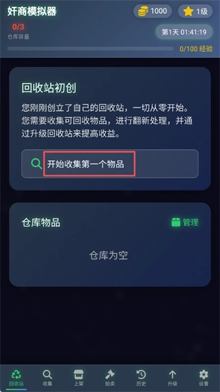 点击【开始收集第一个物品】,开启你的回收站经营之旅,从无到有地收集、翻新、售卖各类物品,一步步拓展自己的商业版图。
