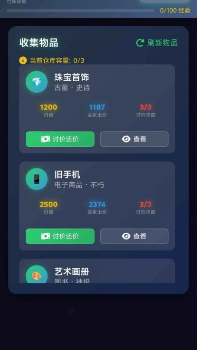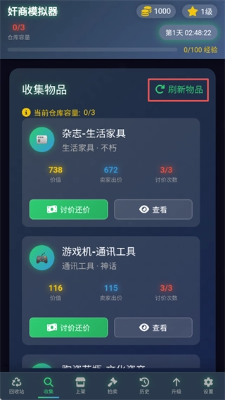 可通过点击【刷新物品】按钮来获取各类不同的回收物,之后结合物品自身的价值、卖家给出的价格以及允许的讨价还价次数,挑选出合适的物品进行议价并完成收购。