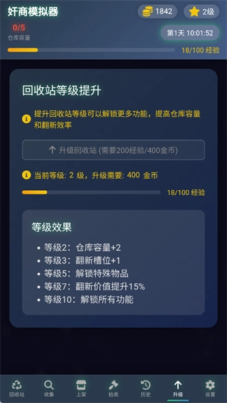 提升回收站等级能够解锁更多实用功能,比如等级2会扩充仓库容量,等级3可增加翻新槽位等。建议积累足够经验与金币后及时升级,这将为你的商业帝国发展提供有力助力。