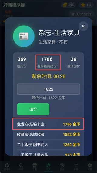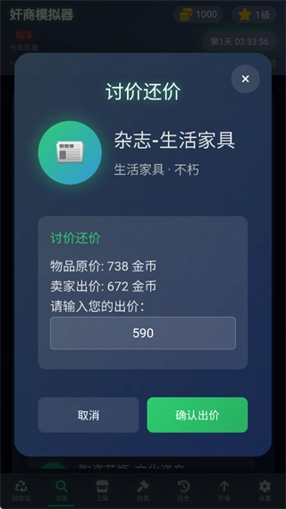 针对物品,在卖家报价的基础上往下砍价(比如从672金币砍到400金币),点击【确认出价】按钮完成收购,通过降低成本来扩大利润空间,做个精明的商人。
