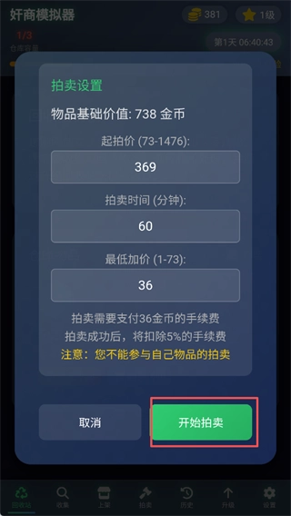 设置合理的起拍价(例如基础价值的50%)、拍卖时长与最低加价幅度,在支付手续费后点击【开始拍卖】按钮,利用拍卖系统来提升物品的售价。