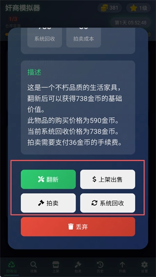 收购的物品可选择翻新、上架出售、拍卖、系统回收这四种处理方式,不朽品质的物品建议优先通过拍卖处理,以实现收益最大化。