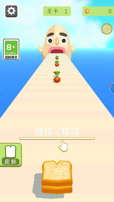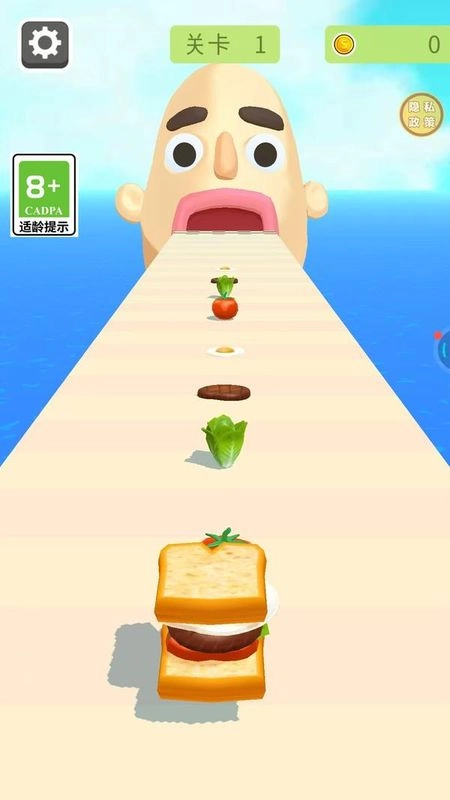 食材接取的操作方式是:用左右滑动屏幕的动作来操控面包片的移动,以此精准接住正在下落的生菜、番茄、肉饼之类的食材。