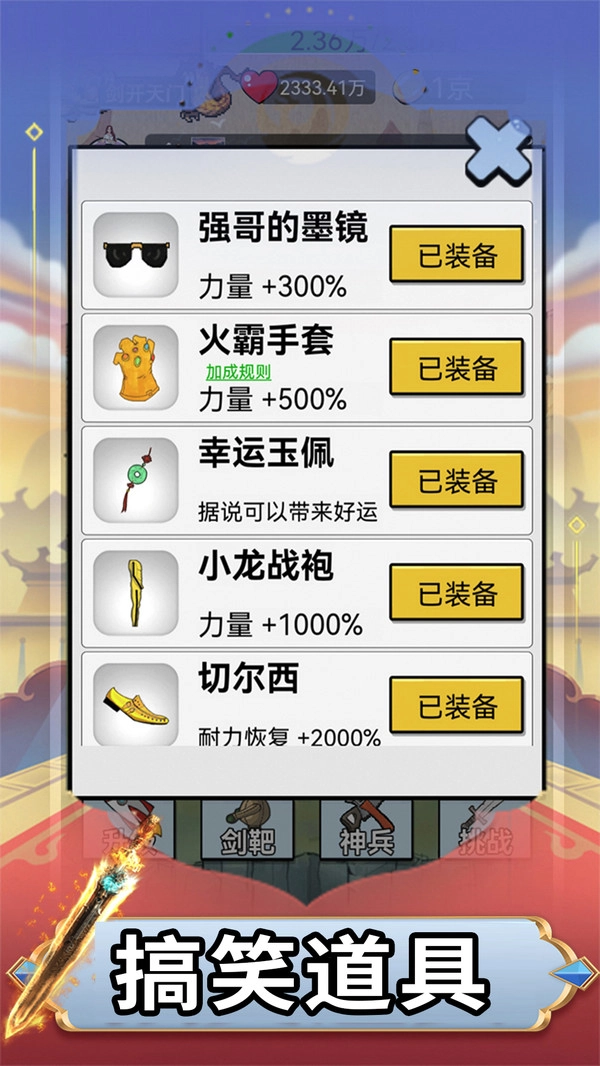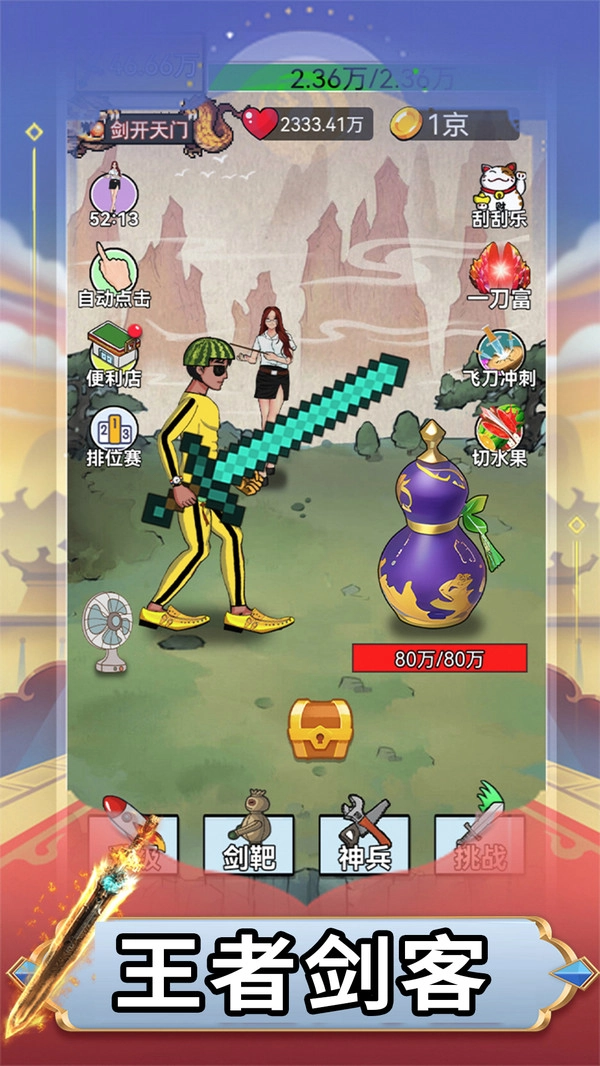 《我功夫贼6》是一款以点击操作为核心玩法的功夫题材休闲游戏。玩家将化身为一名剑客,开启一段充满趣味的冒险之旅。游戏操作简单易上手,只需通过快速点击屏幕来提升出剑速度,就能挑战各路风格迥异的高手——从脑洞大开的普通对手到实力强劲的顶尖强者,每一场对战都充满了未知的惊喜。击败敌人后,还可以获取造型夸张且附带独特特效的武器与装备,助力你在功夫世界中不断成长。